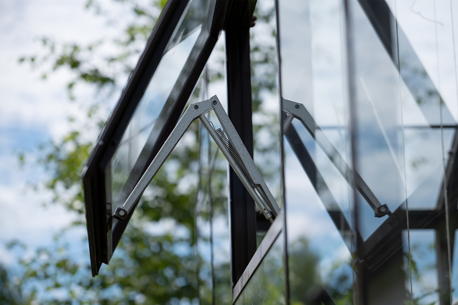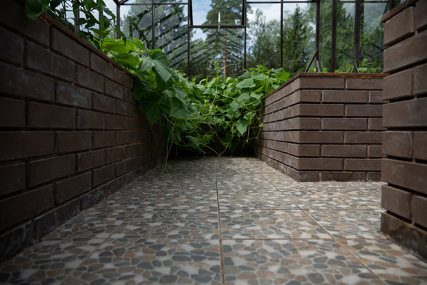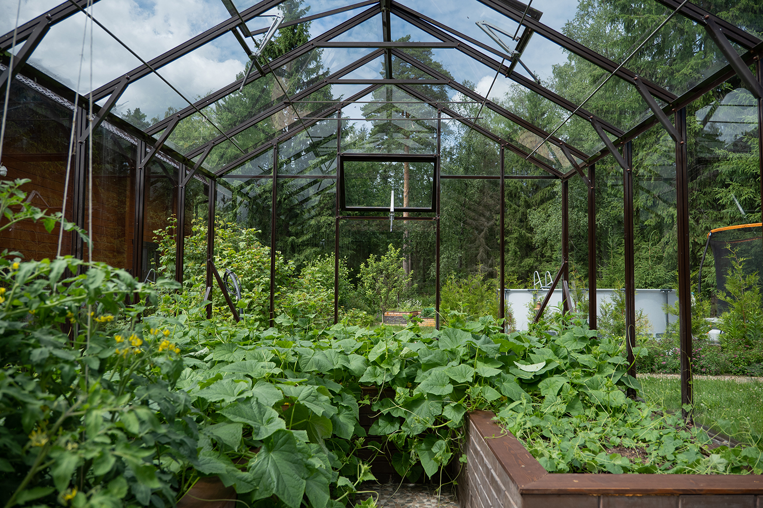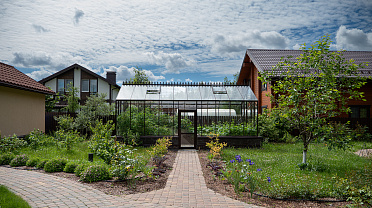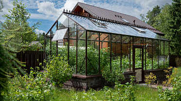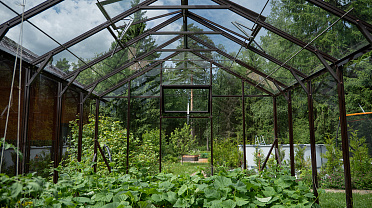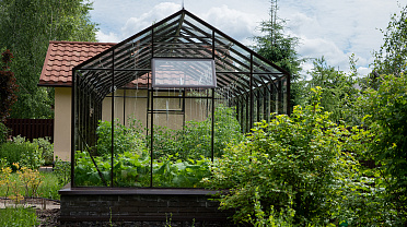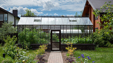 Боковое размещение входа формирует более гибкую планировку и удобную логику использования пространства. Такое решение упрощает зонирование внутри и делает перемещение более естественным, позволяя органично вписать теплицу в участок и создать продуманную и комфортную рабочую среду.